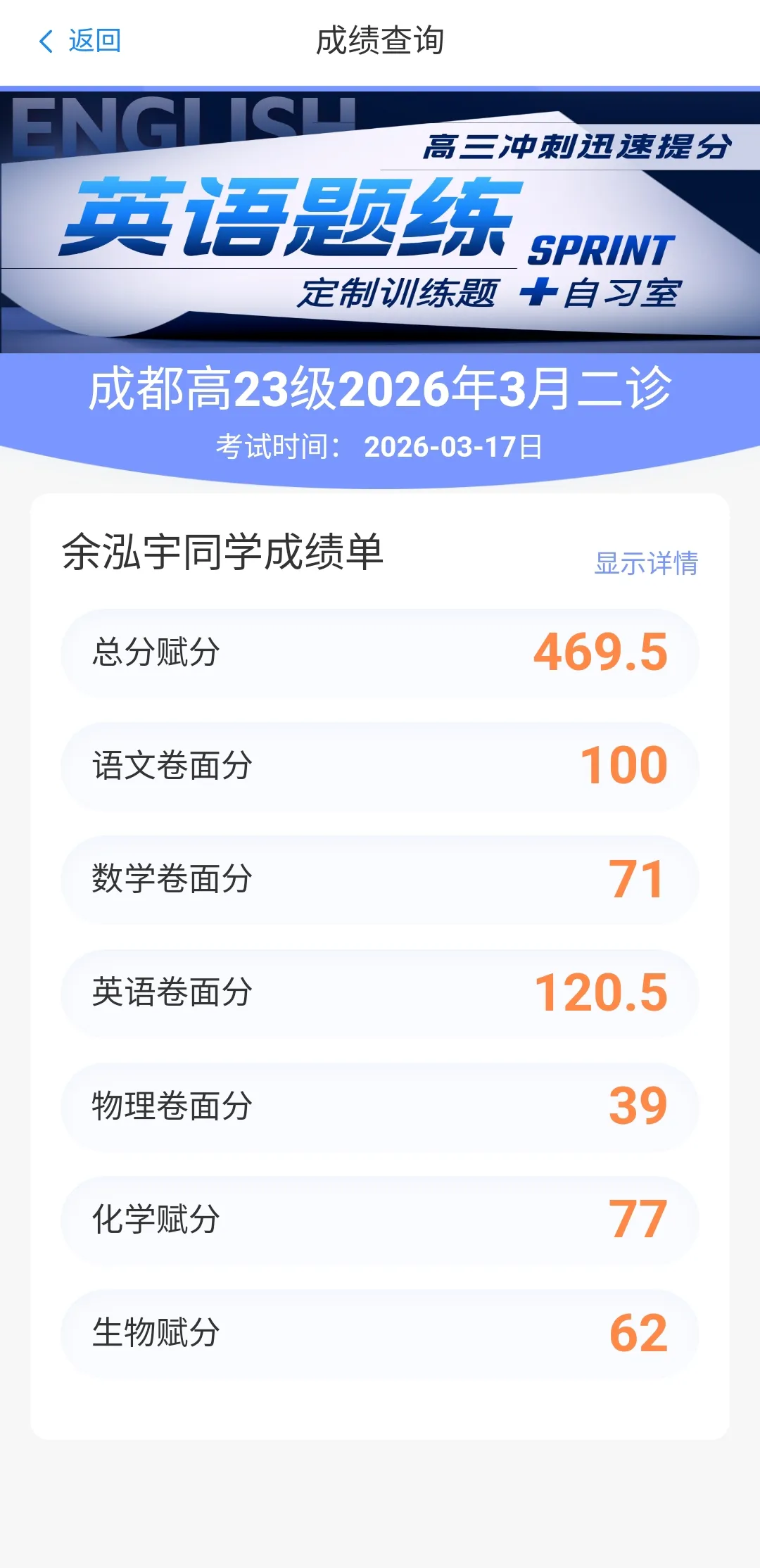 成都二诊成绩出来了,王俊宇数学物理双满分,只是微微扣了几分,总分 616。我就用 469.5 结束。本来预估只有 430。吕佳豪英语140.5?反正上了140,好像前面扣了 5.5,后面一共也只扣了4.5。我后面扣了 9 分。我上周把那本腾远英语习题又写完了,之前拿到二轮英语习题册马不停蹄地就把小的那本写完。不停止的头疼。我大概还是有些伤心,我对各方面英语基础,语法可以说烂熟于心,不过做题方面我只是新手而已;我也发现各种试卷、报纸阅读题真是绝佳的阅读材料,我找李老师把剩下好久的英语作业都要过来做了,我靠他们积累单词,觉得趣味无穷,真是停不下来。希望我老了还能抱着一本英语书津津有味地读下去。